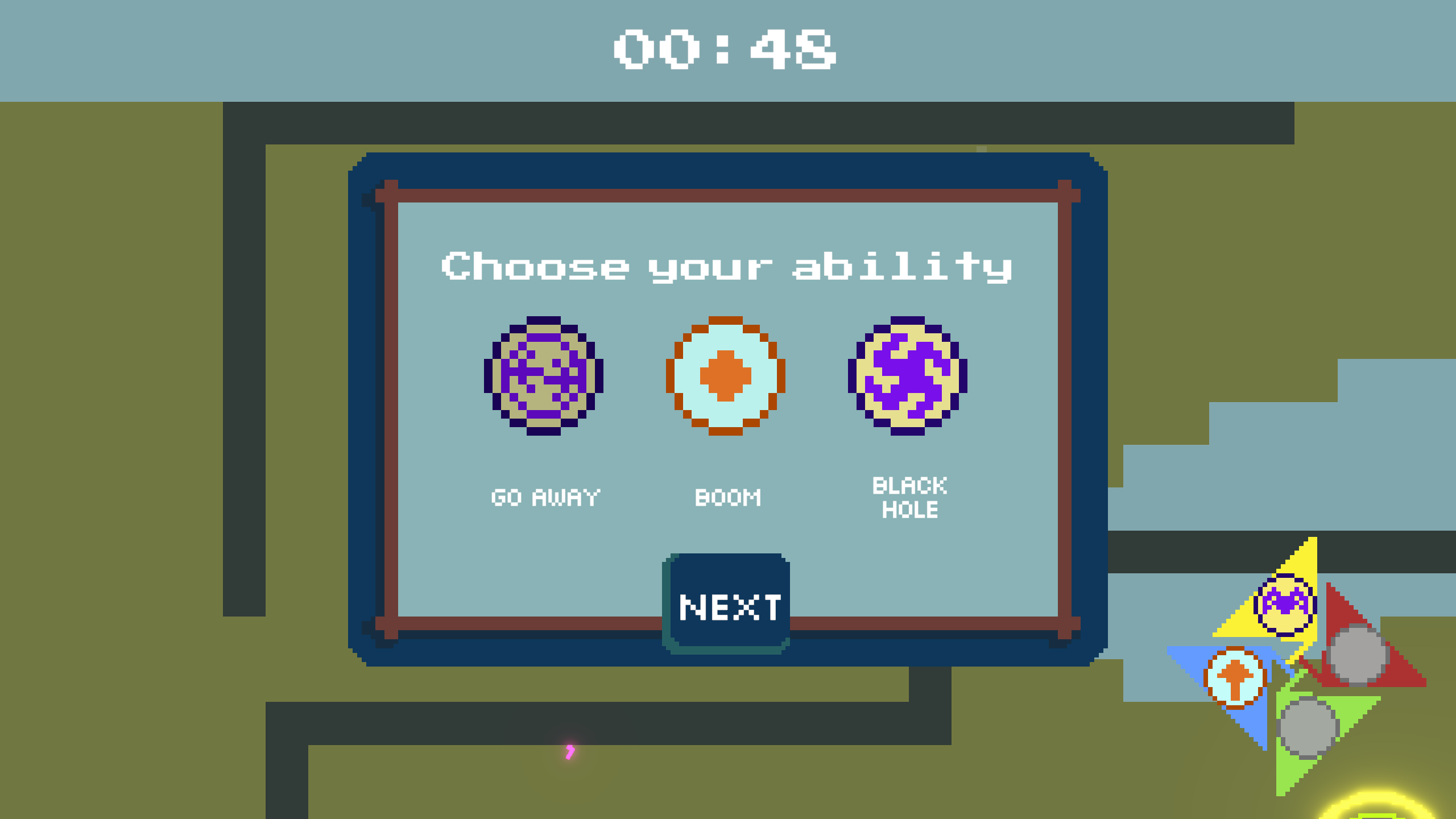 The specificity of the game is that neither enemies nor the player have health points, but instead they can be defeated by falling from a platform. Thus, all the abilities and threats focus on controlling movement of the player and enemies, by pushing or attracting them in different directions.